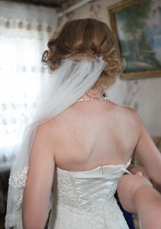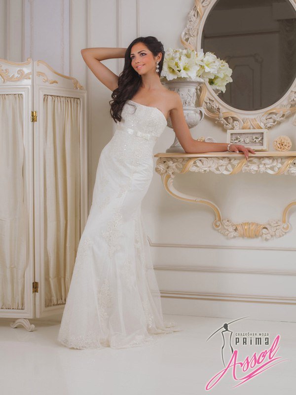 Роскошное платье слегка зауженного А-силуэта, выгодно подчеркивает талию, плавно струясь по бедрам. Корсет и юбка украшены изящной евро-сеткой ”мушка” и изысканным кордовым вышитым кружевом. Дополнительным украшение служит атласная шнуровка и лента с милым бантом. Это восхитительный выбор невест, знающих толк в элегантности. Корсет изготовлен с применением чашек, что придает красивую форму груди.