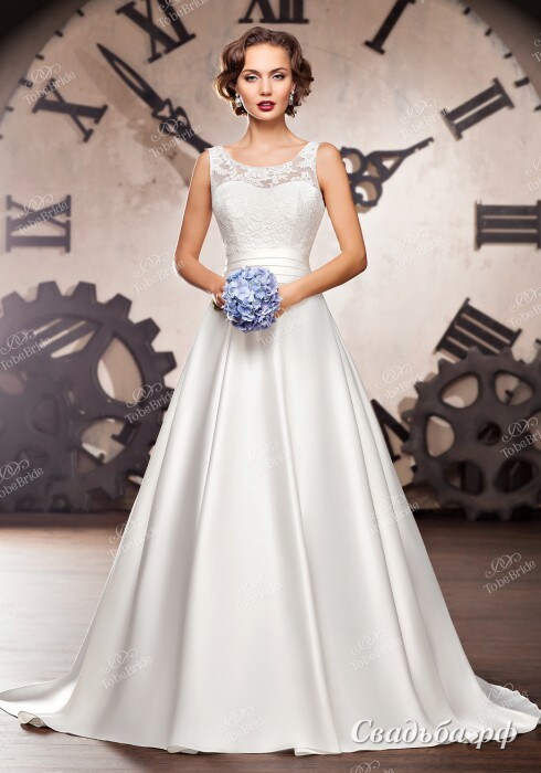 Благородный атлас пышной юбки и нежное кордовое кружево на лифе – стильный и элегантный тандем. Широкий, горизонтально задрапированный пояс, глубокий вырез на спине и отсутствие блестящего декора только усиливают впечатление.