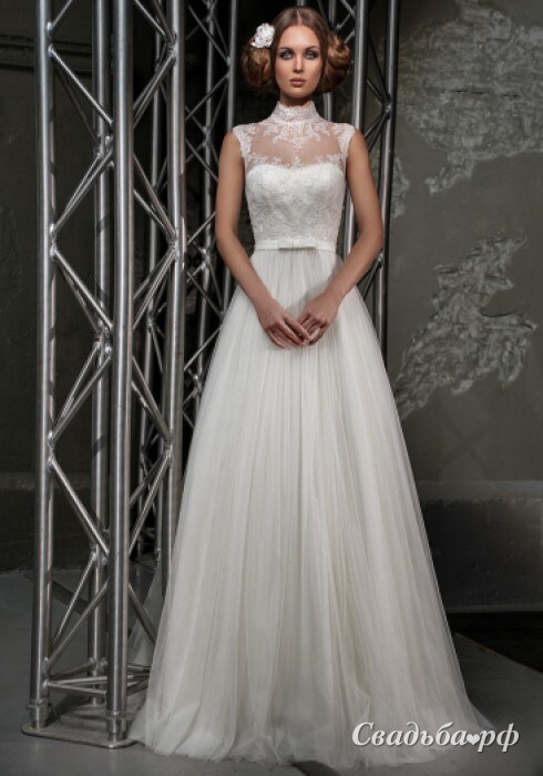 Юбка выполнена из мягкого фатина, верх украшен кружевной маечкой с воротничком-стойкой.