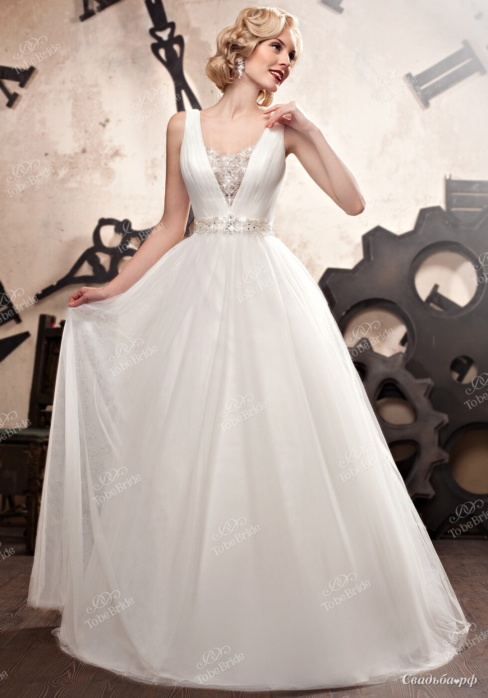 Ткани и отделка: фатин; вставка и пояс расшиты бисером, стеклярусом, стразами и жемчугом.