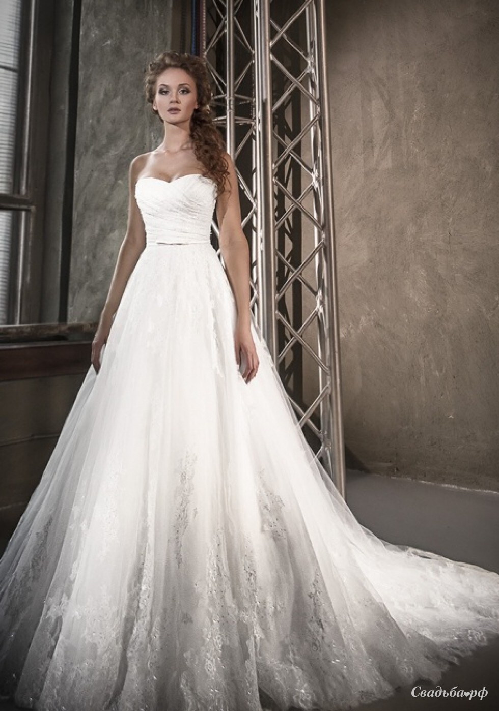 Пышное платье с высокой талией украшенное кружевом и россыпью пайеток.