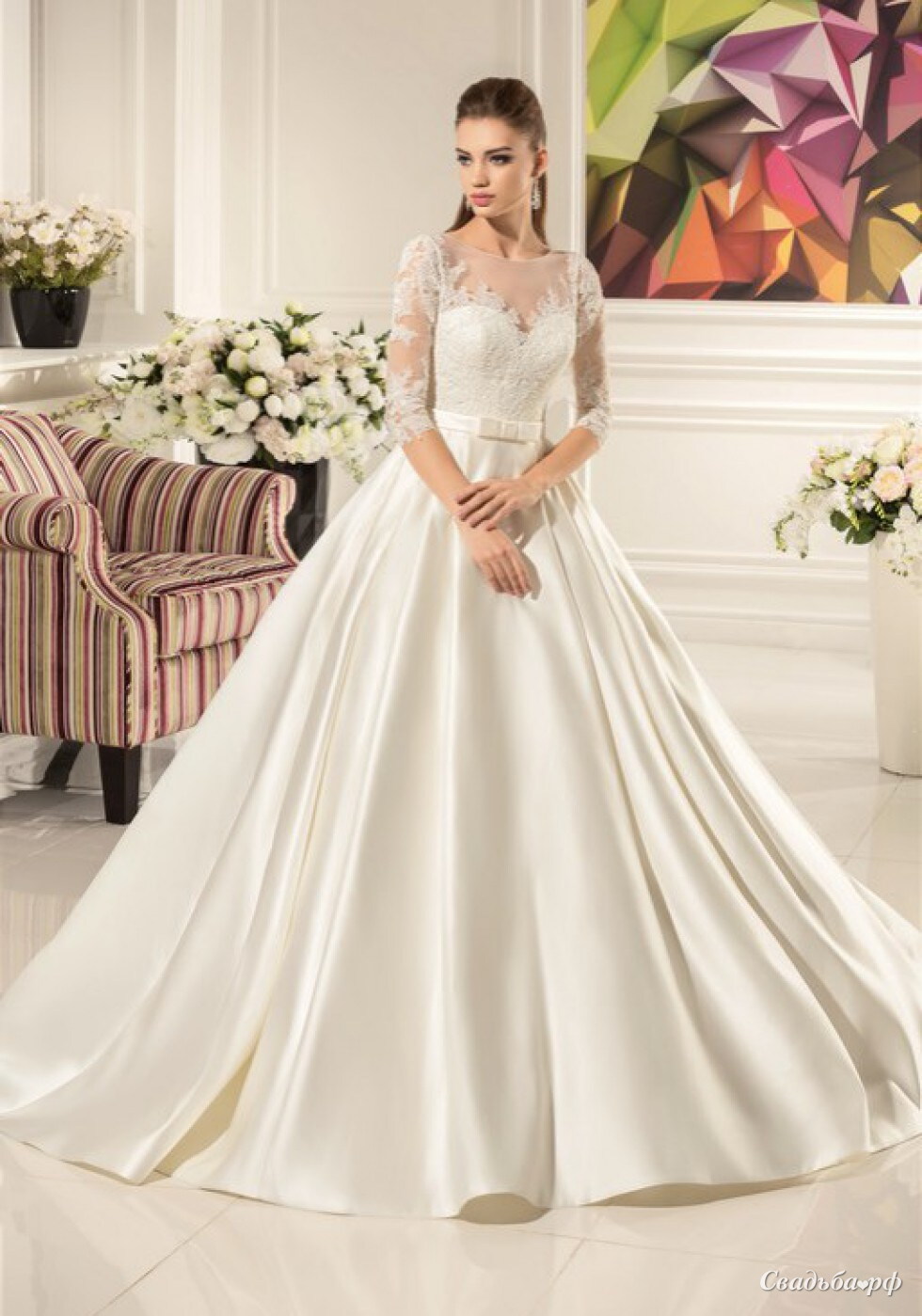 Роскошное платье с гладкой атласной юбкой и кружевным верхом.