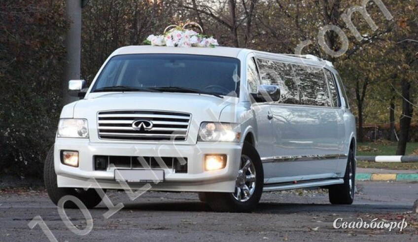 Лимузин Инфинити (Infiniti QX 56) цвет белый, количество мест 20, панорамное стекло, комбинированный кожаный салон, TV, DVD, MP3, CD, караоке, диско-бар, диско-пол, диско-потолок, неоновая подсветка салона, интерком с водителем, барная посуда, кондиционер, сенсорная панель управления салоном.